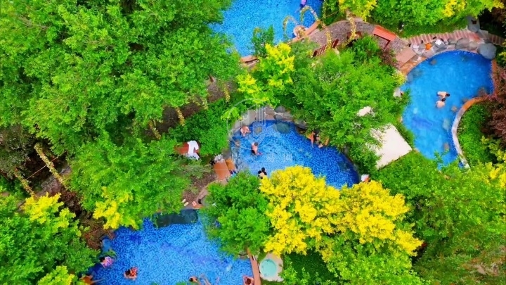 酒店采取温泉康养度假村模式,拥有388间客房、50多个室内外温泉池,集休闲汗蒸、餐饮美食、中医养生、保健理疗、客房住宿、商务会议、康体健身、儿童乐园、棋牌康乐、KTV等系列娱乐休闲项目,配备200多个地面停车位,20多个电动车充电桩。