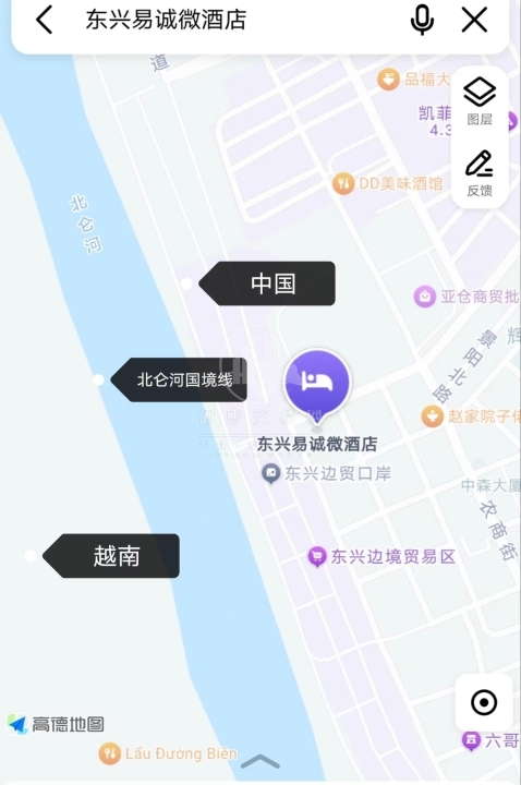 酒店位于防城港东兴市,周边有诸多物流公司、酒吧、边境贸易区客源稳定,设施齐全。在房间就可以直视越南芒街风貌。