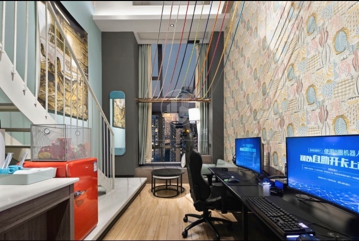 重庆杨家坪电竞酒店,位于杨家坪步行街附近,紧挨万象城。一千五百平,LOFT房型,高空落地窗可城市观景。电竞设备均为40系列。